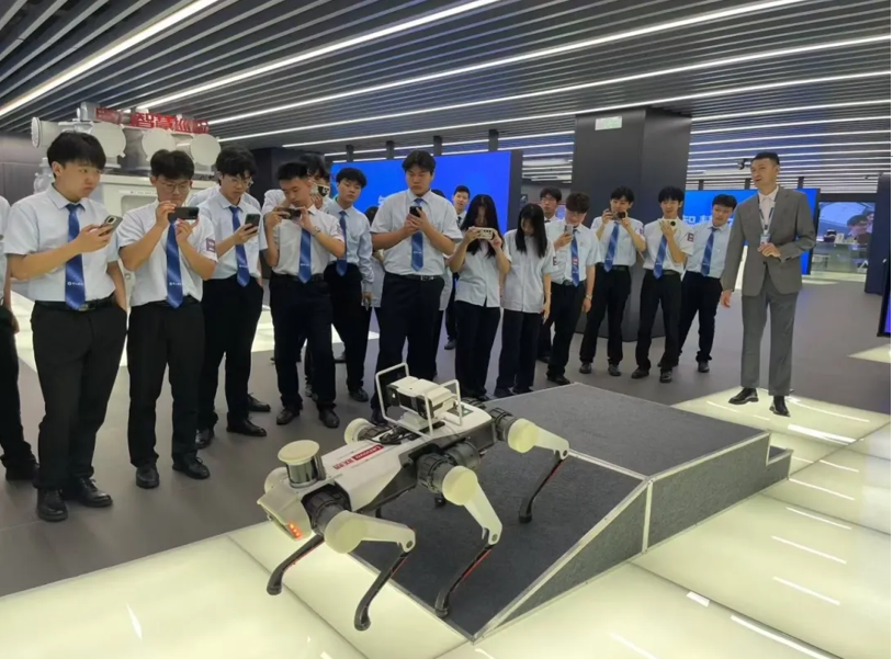 在智能制造展区,联想通过 AI 驱动的自动化设备、数字孪生和物联网(IoT)技术,将工厂的智能化管理与柔性生产展现得淋漓尽致。大家亲眼见证大数据分析和边缘计算如何优化供应链、预测设备维护需求,大幅提升生产效率。最令人震撼的是智能机器狗,它灵活地穿梭于设备之间,用高精度视觉识别系统读取仪表盘数据,检测压力、温度、转速等参数,毫秒级完成异常诊断并预警。“这不仅解放了人力,更把危险的巡检工作变得安全高效!” 现场还模拟了机器狗在高危环境下替代人工作业的场景,让同学们直观感受到 AI 与具身智能技术如何推动企业迈向 “无人化” 与 “精益化” 制造。