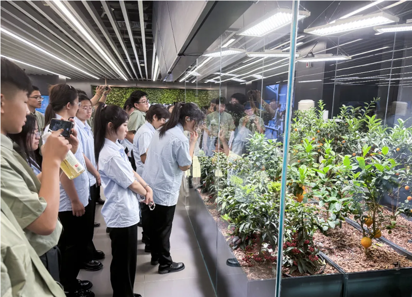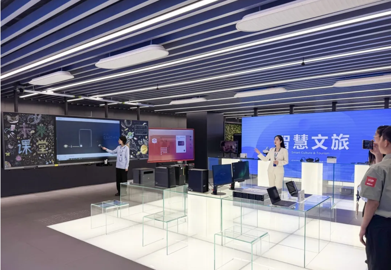 踏入这座充满科技感的空间,“科技赋能未来” 的设计理念扑面而来,环形动线仿佛一条时光隧道,将参观者引入前沿科技世界。场馆内,智能制造、智慧教育、智慧文旅、智慧农业、智慧办公等展区彼此既独立成篇又相互关联,结合人工智能、行业元宇宙、高性能计算、物联网等新技术,全方位呈现着联想赋能各行业智能化转型的最新实践成果,宛如一幅徐徐展开的数字化转型长卷。当全息投影在地面勾勒出科技脉络,同学们不由自主地发出阵阵惊叹,仿佛置身于科幻电影中的未来世界。
