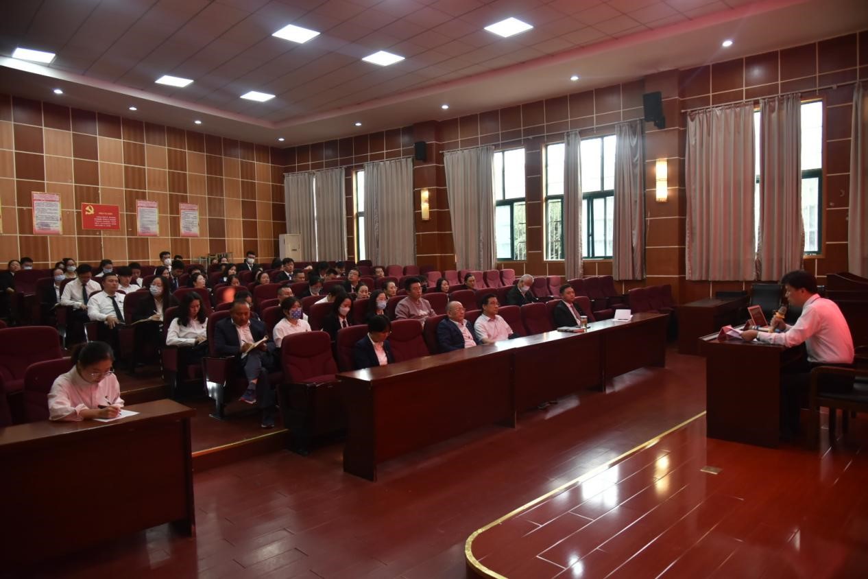 会上,周俊波书记首先对人性、德性和党性进行了解释并生动直观地讲解了三者之间的逻辑关联性。然后聚焦学习贯彻党的二十大精神这一核心内容和主线,从深刻认识党章的重要地位和作用、历届党章的回顾、全面掌握二十大党章修改的主要内容、准确把握学习贯彻新党章的实践要求进行了深入解读。周俊波书记的授课主题鲜明、内容丰富、案例详实、深入浅出,引导全校党员和教职工深入、全面、系统地理解掌握新党章内容。